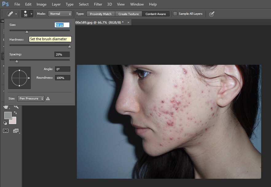 2 To use the healing brush I Option/Alt-clicked to define the source point, which in this example was a clean area of skin texture. I was currently able to retouch with the healing brush. within the example shown here, I merely clicked on the blemishes to get rid of them with the healing brush. If you are using a pressure sensitive tablet as an input device, then the default brush dynamics will be size sensitive. You can use light-weight pressure to color with a tiny low brush, and use heavier pressure to induce a full-sized brush.
