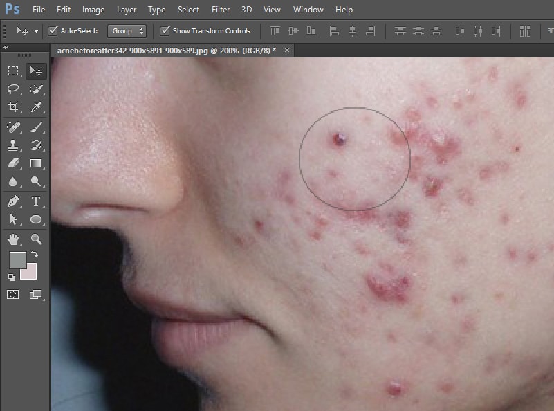 3 continued using the healing brush to complete the skin tone retouching. In this example I sampled one pixel source point for the mouth areas and another to retouch the face.