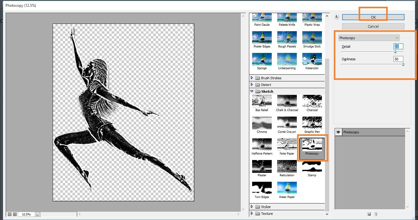 Go to filter> and <filter gallery> and open the sketch> and click photocopy>