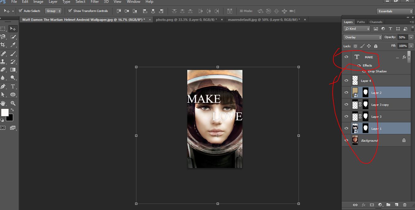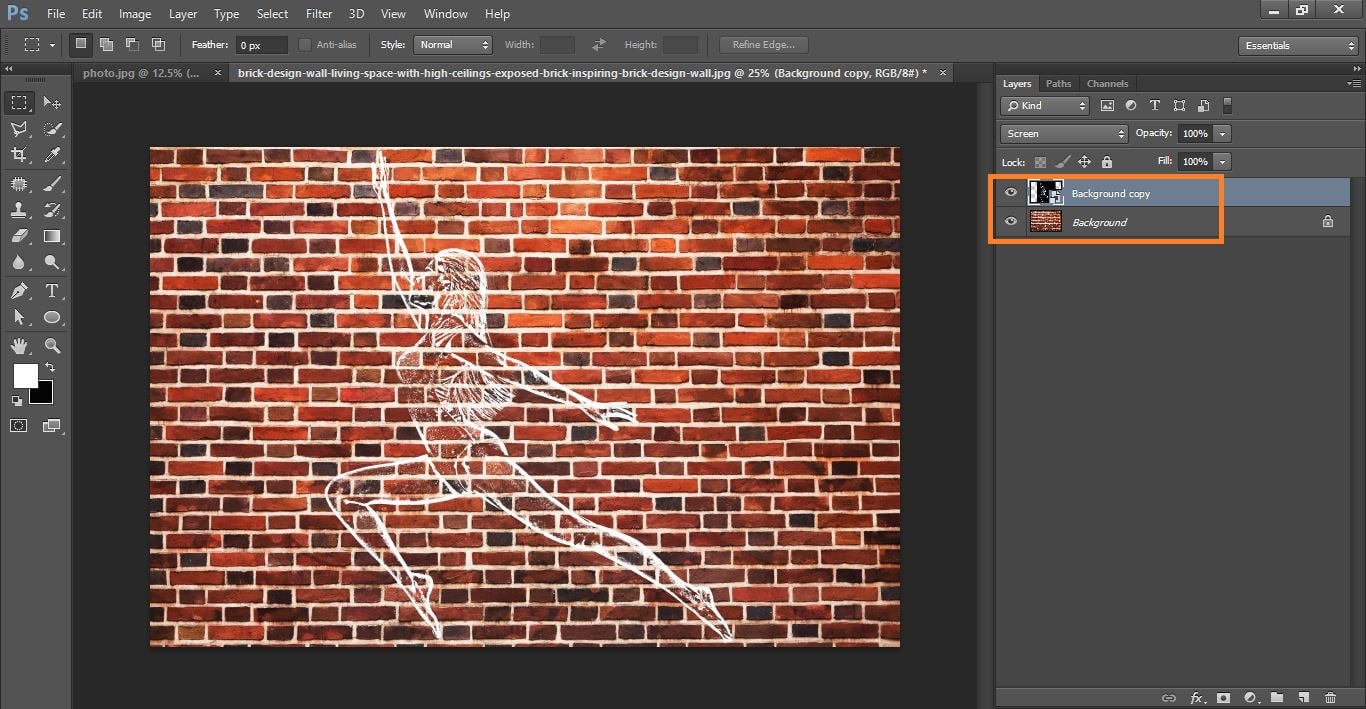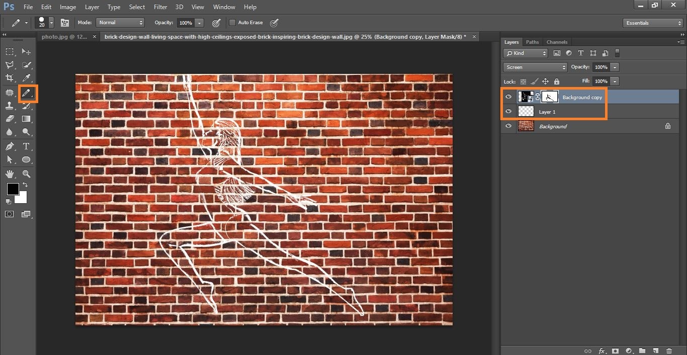 Now active your move tool and dreg the photo go to the brick photo and keep it and change the blending mode to screen